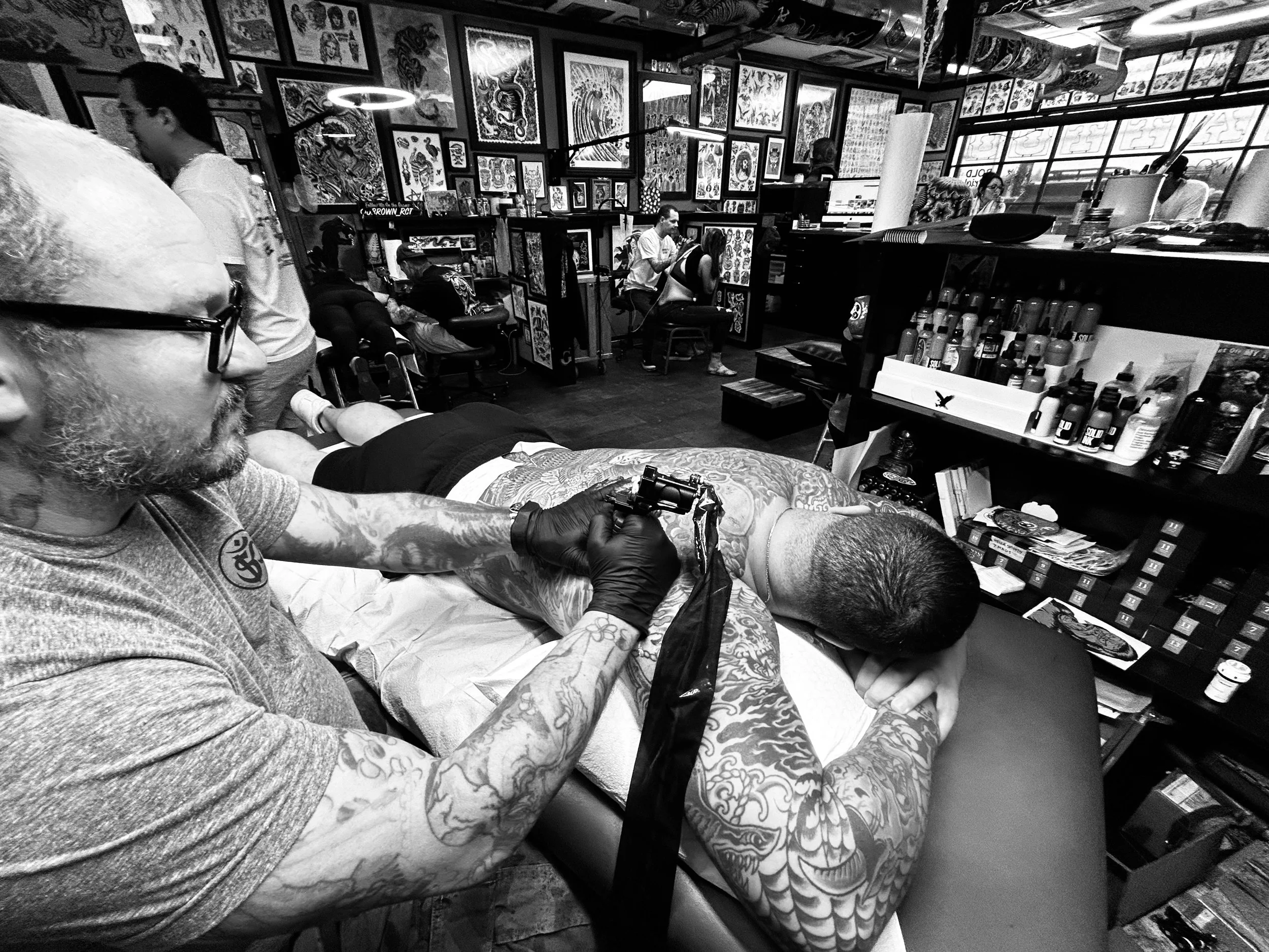We specialize in all aspects and styles of tattooing from black and grey portraits, fine line, nautical, traditional Americana, and large scale Japanese tattoos as well as short and sweet first-timers. Our staff is homegrown from this area with over 40 years of combined experience. Built from the ground up, our shop has an "open air" tattoo environment, so as soon as you walk through our doors you can witness the sights and sounds of "REAL" tattooing. Our walls are lined with thousands of designs as well as reference books to help find that special design.